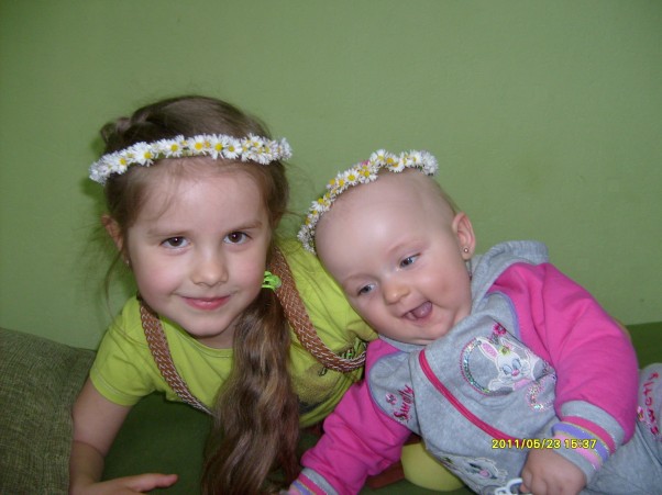 Wesołe wiosenne zabawy z wiankami na głowie.