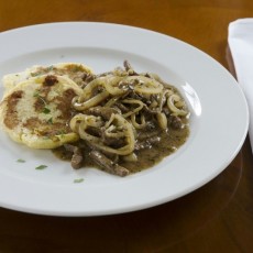Mięso wołowe kroimy w paseczki, posypujemy solą, pieprzem i dodajemy do cebuli. Podsmażamy krótko, przyprawiamy roztartym majerankiem, zalewamy wywarem warzywnym i dusimy do miękkości.