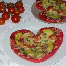 Pokrusz drożdże do miski, wlej trochę wody, dodaj szczyptę cukru i mieszaj, aż drożdże się rozpuszczą. Dodaj resztę wody, olej, sól i mąkę wymieszaną z barwnikiem. Wyrabiaj ciasto, aż będzie gładkie, po czym przykryj je i pozostaw w ciepłym miejscu do wyrośnięcia. Awokado przekrój na połówki, usuń pestkę, wydrąż miąższ i pokrój go w plasterki a następnie skrop sokiem z cytryny. Pomidorki umyj, osusz i przekrój na połówki. Ser żółty zetrzyj na tarce a mozzarellę osącz z zalewy i pokrój w plasterki, Ciasto podziel na 4 części, z każdej uformuj pizzerinkę w kształcie serca i połóż na posmarowanej olejem blasze. Na każdej rozsmaruj przecier pomidorowy i ułóż awokado, pomidorki i mzzarellę. Posyp startym żółtym serem i ziołami. Wstaw do piekarnika i piecz ok. 30 minut w temperaturze 180oC. Przed podaniem posyp posiekanym szczypiorkiem.