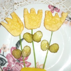 Sposób przygotowania: Kromki chleba smaruj masłem i połóż na nich plasterki żółtego sera. Z każdej kromki wytnij kształt tulipana. Piec w piekarniku 10 minut w temp.190 st.Po upieczeniu do każdego kwiatka dołącz szczypiorek, a z ogórka zrób liście.Smacznego!