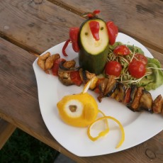 Wykonanie Cukinię pokroić na długie pionowe plasterki, pierś na kwadraty, a pomidorki na połówki. Wszystkie składniki oprószyć przyprawą do grilla i nakładać przemiennie na patyczki. (Cukinia utworzy nam harmonijkę, jako długi plaster przekładamy raz z prawej raz z lewej strony poszczególnych składników). Gotowe szaszłyki ułożyć na ruszcie i grillować do miękkości. Podawać z kiełkami wymieszanymi z pomidorkami podanymi na sałacie. Dodatkowo z cukinii i papryki można zrobić zadziorną papugę, a cytryny śmieszną myszkę. Takie szaszłyki pod papugą zasmakują małym i dużym.