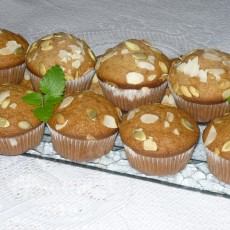 W misce połączyć mąkę, proszek, sodę, cynamon, gałkę i sól. W drugiej misce utrzeć masło i cukier na gładka masę. Dodać dynię i jajko. Dokładnie wymieszać. Na końcu dodać zmieszane suche składniki. Wymieszać. Ciasto ponakładaj do foremek na muffinki, po czym w każdą muffinkę posyp pestkami dyni i płatkami migdałowymi. Gotowe muffinki wstaw do nagrzanego piekarnika i piecz w 1800 ok. 20 minut.