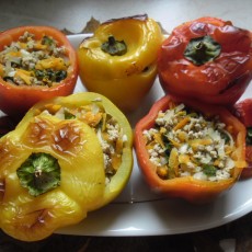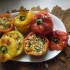 Marchewkę i cukinię ścieram na grubych oczkach, cebulę, siekam na kawałki. Wrzucam wszystko partiami na oliwę i krótko podsmażam. Dodaję mięso mielone, doprawiam czosnkiem, solą i pieprzem w ilości zależnej od upodobań. Smażę 10-15 minut. Farsz nie musi być dobrze przesmażony, “dojdzie” podczas zapiekania. W paprykach odcinam górę, usuwam gniazda nasienne i faszeruję. Wstawiam je na ok. pół godziny do piekarnika rozgrzanego do 180 st. Wspaniałe jesienne danie.