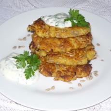 Dynie dokładnie umyj, obierz i usuń z niej pestki. Następnie zetrzyj na tarce o dużych oczkach. Z uzyskanej masy odciśnij nadmiar soku. Pestki dyni oraz słonecznika upraż na suchej patelni- uważaj aby ich nie przypalić. Miąższ połącz z pestkami, dodaj przeciśnięty przez praskę ząbek czosnku. Posól do smaku i wbij 1 jajko. Następnie dodaj bułkę tartą- tyle aby uzyskać jednolitą gęstą masę ( ok. ½ szklanki). Wilgotnymi dłońmi uformuj nieduże kotlety, obtocz je w mące i smaż z obu stron na rozgrzanym oleju ( na wolnym ogniu) przez 4 minuty. Podawaj z ziołowym dipem. Ziołowy dip: 200 ml jogurtu połącz ze zmiażdżonym ząbkiem czosnku, dopraw sola i pieprzem. Dodaj 3 łyżki posiekanej natki pietruszki i mięty i dokładnie wymieszaj.