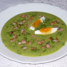 Porcję rosołową oczyść i opłucz, włóż do garnka, zalej 1,5 l wody. Doprowadź do wrzenia, odszumuj. Marchewki obierz, opłucz i pokrój w plasterki. Pora umyj i pokrój w cienkie krążki. Cukinie umyj i pokrój w plasterki. Do wywaru wrzuć marchewki i krążki pora. Gotuj na małym ogniu około 20 minut. Wrzuć plasterki cukinii i gotuj jeszcze 10 minut. Po tym czasie wyjmij porcję rosołową i całość zmiksuj na krem. Zupę połącz ze śmietaną, dopraw do smaku solą i pieprzem. Szynkę pokrój w kostkę, zrumień na rozgrzanym maśle. Jajka ugotuj na twardo, ostudź, obierz i pokrój na ćwiartki. Zupę rozlej na talerze, dodaj podsmażoną szynkę i pokrojone jajka. Przed podaniem zupę posyp posiekanym koperkiem.