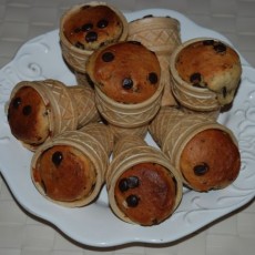 Mąkę, olej, jogurt, jajko, cukier i proszek wkładamy do miski i mieszamy je łyżką, aż do całkowitego połączenia się. Gorzką czekoladę siekamy na drobne kawałeczki i dodajemy do masy. Tak przygotowaną masę przekładamy do wafelków do lodów. Z wierzchu dekorujemy czekoladowymi kropkami. Wstawiamy do nagrzanego piekarnika i pieczemy ok 25 minut w temperaturze ok 180 stopni.