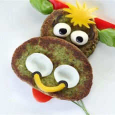 Brokuły gotujemy na parze, 1 jajko gotujemy na twardo. Gdy brokuły będą gotowe odciskamy je z nadmiaru wody i mielimy w maszynce do mięsa razem z jajkiem. Wbijamy surowe jajko, dodajemy otręby pszenne, mielone pestki dyni i odrobinę soli. Dokładnie mieszamy. Zagęszczamy bułką tartą tak , aby można było formować kotleciki. Rozgrzewamy patelnie z niewielka ilością oleju i smażymy z obu stron na złoty kolor. Kotleciki nakładamy na siebie robiąc głowę, z ugotowanego jajka, oliwki i papryki robimy nos. Z małych kuleczek mozarelli i oliwek – oczy. Czuprynę na głowie krowy i rogi robimy z wyciętej papryki, a uszy z bazylii. Z pomidora formujemy język.