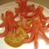 Pomarańcze myjemy, wyciskamy sok i pozbywamy się miąższu. Galaretki rozpuszczamy w połowie wody i przestygnięte wlewamy do pucharków z pomarańczy. Wkładamy do lodówki. Gdy stężeją kroimy na mniejsze kawałki przypominające łódeczki.