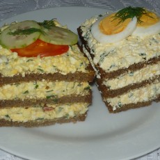 Jajka ugotuj na twardo. Zalej zimna wodą, odstaw, żeby ostygły. Następnie obierz i drobno posiekaj. Posiekaj dymkę razem ze szczypiorkiem, dodaj do jajek. Dołóż musztardę oraz majonez. Dokładnie wymieszaj (jeśli pasta wyszła zbyt gęsta, można dodać 1-2 łyżeczki jogurtu naturalnego). Dopraw solą i pieprzem. Kromki chleba przełóż przygotowaną pastą. Na warstwach pasty jajecznej ułóż plasterki pomidora i ogórka, lekko dociśnij. Rozetnij poprzecznie na dwie porcje. Twaróg zmiksuj z majonezem, musztardą oraz ze śmietaną. Dodaj dwa drobno pokrojone jajka na twardo. Dopraw solą, pieprzem, natka i koperkiem. Kromki chleba przełóż przygotowana pastą i rozetnij na dwie porcje.