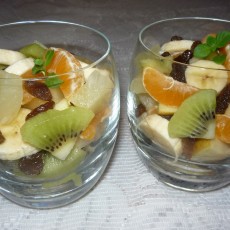 Jabłka umyj, osusz i pokrój w kostkę. Obrane banany pokrój w plasterki, kiwi w kostkę. Mandarynki obierz i podziel na cząstki. Jabłka i banany skrop sokiem z cytryny żeby nie ściemniały. Krążki ananasa osącz z syropu i pokrój w kostkę. Owoce połącz w misce, dodaj namoczone wcześniej i starannie osączone rodzynki. Miód rozprowadź kilkoma łyżkami przegotowanej letniej wody. Polej sałatkę, delikatnie wymieszaj. Udekoruj listkami mięty lub melisy.