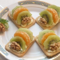 Przygotowanie: • Owoce obrać, kiwi pokroić w półplasterki, mandarynki podzielić na cząstki. • Orzechy rozłupać, podzielić na kawałki. • Z natki, sera, majonezu, soli i pieprzu zrobić gładką pastę. • Posmarować nią krakersy. • Ozdobić kawałkami owoców i orzechów.
