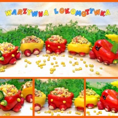 Paprykę czerwoną i żółtą pokroić w drobną kosteczkę, natkę pietruszki drobno posiekać, ser zetrzeć na tarce, dodać do tego odsączone z zalewy zawartości dwóch puszek. Dorzucić kiełki fasoli, kiełki brokuła, pałeczki wielozbożowe, ziarna słonecznika i pestki dyni (ziarna i pałeczki mogą być rozdrobnione blenderem). Przyprawić wszystko pieprzem, solą oraz mieszanką przypraw, dodać majonez i wszystko razem dobrze wymieszać. Tak gotową sałatką wypełniamy przygotowane wcześniej wagoniki. Przyprawy można użyć inne, wedle uznania i własnych upodobań. Wagoniki z papryk śmiało możemy wypełniać różnymi farszami i dekorować je według własnego pomysłu. Jak połówki rzodkiewek będą dobrze umocowane na wykałaczkach, to cała lokomotywka będzie jeździła.