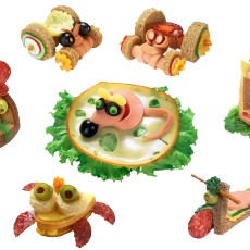 Co tylko nam podpowie wyobraźnia możemy wykonać np. : krab z chleba lub bułki robimy korpus z plasterków przekrojonych na pół np.salami czy też innych okrągłych robimy macki na to plasterek sera żółtego (jak na zdjęciu) lub plasterek pomidora oczka mogą być zrobione z oliwek lub dodatkowo podniesione na kółeczkach wykrojonych z chleba jeśli ktoś lubi może mieć zabawne "ząbki" z kukurydzy rowerek-skuter w kromki chleba najlepiej razowego wykrawamy literę L na ramę kółeczka z wędliny (na zdjęciu z salami) felgi z plasterków parówki osłony ze skórki z ogórka jako światła użyłam oliwek na siedzeniu jest plasterek sera, ogórek i kawałek parówki kierownica z paluszka słonego myszka na kromce chleba kładziemy liść sałaty na to najlepiej okrągły plasterek sera żółtego ale może być też inny z mortadeli wycięłam środek w kształcie półksiężyca i podwijając brzegi uformowałam myszkę oczy jak w poprzednim z oliwek i nos także źrenice z groszku konserwowego uszka to ser żółty wycięty w półserce pozostałe to kombinacja ludzików z powywijanych plasterków wędliny na wyciętym w kształcie podpórki chlebie, ponieważ postawione na samej kromce się przewracają. Można też wykonać dekoracje np. muchomorki z połówek pomidora (kropki z majonezu), nóżka z połówki jajka na twardo biedronki z połówki koktajlowych pomidorków a kropeczki np.z goździków życzę miłej zabawy i smacznego