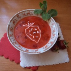 Truskawki umyj, osusz i dokładnie odszypułkuj. Jedna czwartą część owoców pokrój w kostkę i odłóż. Resztę wrzuć do gotującej się wody z cukrem. Gotuj około 15 minut, zmiksuj, dodaj odłożone truskawki i jeszcze raz zagotuj. Dokładnie ostudź. Ugotuj makaron. Ostudzona zupę podawaj ze śmietaną i makaronem.