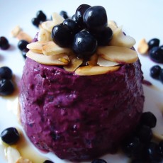 1. Twaróg mielę jednokrotnie. Jagody przebieram, myję i osączam. Garść jagód odkładam. Zmielony twaróg miksuję z jagodami, cukrem waniliowym i miodem lub syropem klonowym. Odłożone jagody rozgniatam widelcem i dodaję do masy, mieszam. Żelatynę zalewam 60 ml wody, mieszam i zostawiam do napęcznienia. Następnie podgrzewam do rozpuszczenia (nie gotuję), studzę. Rozpuszczoną żelatynę dodaję do masy serowej,dokładnie łączę. Masę przekładam do foremek (np. do silikonowych, na muffinki lub umytych i osuszonych kubeczków po jogurtach). Wstawiam do lodówki do całkowitego stężenia (ok. 2-3 godziny, a najlepiej całą noc). 2. Płatki migdałowe rumienię na suchej patelni. Jagody myję i dokładnie osączam. Serniczki wykładam na talerze, skrapiam miodem lub syropem klonowym, obsypuję płatkami migdałowymi i jagodami.