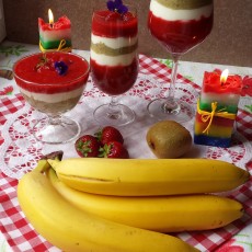 Truskawki umyj dokładnie i usuń szypułki. Wrzuć do miski i zmiksuj na gładką masę. Dodaj cukier do smaku. Kiwi obierz i zmiksuj w drugiej misce z bananem. Do jogurtu dodaj mleko i dokładnie wymieszaj. Chodzi o to, aby wszystkie masy miały podobną konsystencje. Na dno kieliszka wlej masę truskawkową, na nią wyłóż jogurt, potem kiwi z bananem, kolejno jogurt i na wierzch znowu truskawki ( albo inna opcja). Gotowy deser wstaw do lodówki, aby mocno się schłodził.