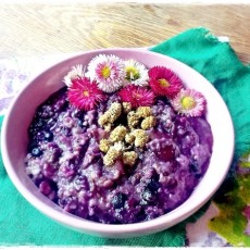 Płatki, otręby, morwę, len i siemię lniane solę i zalewam mlekiem rozrobionym z kakao. Zagotowuję, wyłączam palnik i odstawiam pod przykryciem. Śliwki kroję w dość dużą kostkę i łączę z jagodami. Podgrzewam na patelni masło, dodaję owoce i miód. Grzeję chwilę i dodaję do owsianki. Płatki pochłonęły dużo płyny, więc dolewam jeszcze trochę mleka. Wszystko razem mieszam i zagotowuję ponownie. Zmniejszam palnik do minimum i podgrzewam jeszcze kilka minut. Przekładam śniadanie do miski, ozdabiam morwą i stokrotkami.