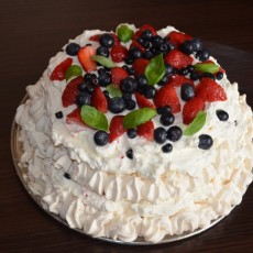 Schłodzone białka ubić na sztywno, dodawać po łyżce cukier, na końcu mąkę i ocet-piana ma być błyszcząca i sztywna. Na papierze do pieczenia szprycownicą wyciskać małe beziki tak aby się łączyły w całość-zrobić 2 blaty większy (ok 26-28 cm) i mniejszy (ok 24 cm). Włożyć do nagrzanego do ok 150 st. piekarnika po czym zmniejszyć na 100-110 st. i suszyć przy uchylonych drzwiczkach ok 1,5-2 godziny(sprawdzać czy jest dobrze wysuszona beza) Ubić na sztywno śmietanę ze śmietan-fixami (nie dawać cukru, beza jest wystarczająco słodka). Na większy blat wyłożyć połowę śmietany, truskawki w ćwiartki, jagody/borówki przykryć mniejszym blatem, wyłożyć resztę śmietany, truskawki, jagody, ozdobić listkami bazylii. Uwaga-przygotować tuż przed podaniem, żeby beza nie zmiękła