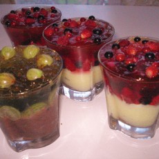 budyń waniliowy/czekoladowy, galaretka wiśniowa/agrestowa,biszkopty,owoce poziomki, maliny, czarne i czerwone porzeczki, agrest( najlepiej jak zerwane z krzaczka w ogródku:))