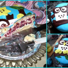 Na pierwszy blat nakładamy sporą warstwę kremu,później maliny i tak na zmianę .Na ostatni blat biszkopta kładziemy delikatną warstwę kremu i nakładamy masę cukrową i ozdabiamy wedle uznania.Na pierwszy roczek córeczki zrobiłam sowę bo bardzo je lubi .:)