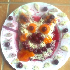 Do przygotowania dania użyłam 2 rodzaje kształtu makaronu ( dinozaury, nitki), i przygotowałam je zgodnie opisem na opakowaniu. Ugotowany makaron ozdobiłam wiśniami z słoika i dżemem z dyni, a całość polałam sokiem z wiśni. Danie jest gotowe. Banalność tego dania ułatwia domowe obowiązki i można z łatwością połączyć je z zabawą z dzieckiem. Dodatkowo zachęca to innych rodziców do przygotowywania własnych przetworów z owoców, których często nam brakuje poza sezonem. Danie można przygotować na tysiąc sposobów, potrzebna jest Tylka nasza inwencja twórcza. Latem można dodać świeże owoce i polać odrobiną jogurtu naturalnego. Świetnie smakuje również z pokruszonym serem i posypanym odrobiną cukru ( biały lub brązowy). Dodatki do makaronu zależą od naszych upodobań, od słodkich do słonych. Użyć można też makaronu kolorowego. Barwność tego dania zachęci do jedzenia nawet „niejadka”. Polecam. Makaron świetnie smakuje z owocami z kompotu wiśni, truskawek lub polane sokiem czy z galaretką z porzeczek. Zamiast makaronu można ugotować ryż na mleku na gęsto i dodać ulubione dodatki, smakuje tak samo PYSZNIE.