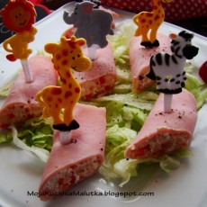 Kasze perłową gotujemy według przepisu na opakowaniu. Po ugotowaniu studzimy. Do zimnej kaszy dodajemy serek mascarpone. Paprykę czerwona myjemy i kroimy w bardzo drobna kosteczkę dodajemy do kaszy. Solimy i doprawiamy pieprzem do smaku. Masą smarujemy plasterki szynki i zwijamy w rulonik. Spinamy patyczkiem.