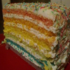 Ciasto - biszkopt: Ubijasz białka, dodajesz cukier – ubijasz, dodajesz żółtka – ubijasz, dodajesz mąkę z proszkiem i mieszasz. Ja podzieliłem na 2 razy (z 8 jajek) bo mi się do robota nie mieściło naraz. I jak wymieszasz wszystko to dzielisz na 6 części i dodajesz do każdej barwnik (fioletowy, niebieski, zielony, żółty, pomarańczowy, czerwony) i pieczesz w 180-190st ok. 20min. każdy osobno trzeba. Masa: Wszystko zmiksować i wstawić do lodówki na 1-2godz Potem wykładasz biszkopty w kolejności jak tęcza fioletowy, niebieski, zielony, żółty, pomarańczowy, czerwony) i przekładasz masą i dookoła i na wierzchu. Można posypać kolorową posypką. Smacznego!