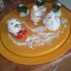 jajka ugotować na twardo,różyczki brokuła tez ugotować i ostudzić ,z twarożku i śmietany zrobić masę i uformować kuleczki na bałwanka ustawić na talerzyku ,z papryki zrobić nos a oczy i guziki z ziarenek pieprzu,brokuły jako drzewka osadzić na masie twarogowej,z jajek robimy króliczki -jajka obieramy z rzodkiewki zrobić łapki z serka uszka ,ziarenka pieprzu użyć na oczka i nosek a ze szczypiorku zrobić wąsiki,z papryki robimy narty na których sadzamy króliczka ,wszystko ustawiamy na talerzu tworząc zimowy krajobraz za pomocą masy twarogowej .To wesołe danie i można dodawać warzywa jakie chcemy a dziecko chętnie zje takiego króliczka czy bałwanka :)