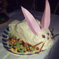 Przygotowanie kremu maślanego: W dużej misce miksujemy masło z ekstraktem waniliowym. Dodajemy cukier po troszku, cały czas miksując. Dodajemy mleko i miksujemy aż powstanie jasna i puszysta masa. Przykrywamy krem do momentu aż będzie użyty do dekoracji. Przygotowanie ciasta: Kroimy biszkopt na pół, tak aby powstały dwa półkola. Jedną połowę smarujemy wcześniej przygotowanym kremem. Składamy obydwie części ze sobą. Ustawiamy płaską krawędzią na talerzu/paterze i wycinamy trójkątny klin bliżej jednego końca. W wyciętym miejscu będzie szyja króliczka, a mniejsza część pozostawiona z przodu będzie jego główką. Wycięty kawałek przyklejamy z drugiej strony jako ogonek. Smarujemy całe ciasto kremem maślanym. Obficie posypujemy wiórkami kokosowymi. Wciskamy kolorowe drażetki jako oczy i nos. Paluszki mocujemy jako wąsy. Z różowego papieru wycinamy uszy, delikatnie zaginamy wzdłuż środka i wtykamy w ciasto. Resztę drażetek rozsypujemy wokół króliczka na paterze. Smacznego :)