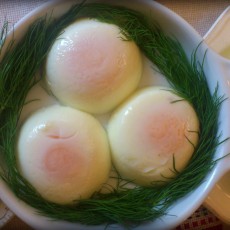 Jajka układamy w plastikowe foremki, które umieszczamy na patelni. Na dno patelni nalewamy wody, przykrywamy przykrywką. Jajka się gotują w kąpieli wodnej 2-3 min. Podajemy z ciepłymi pełnoziernistymi grzankami, suszonymi pomidorami marynowanymi w oliwie i nadziewanymi serem feta ostrymi papryczkami.