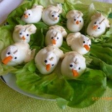 Gotuję jaja na twardo,przekrawam na pół. Drobno siekam pieczarki,podsmażam na oleju. Po wystudzeniu pieczarki łączę z żółtkami jaj i doprawiam solą i pieprzem, nadziewam farszem białka.Układam jajka na liściach sałaty farszem do dołu. Na talerzyku rozcieram widelcem biały ser,następnie formuję dłońmi małe kulki(główki kaczuszki),i łączę je z połową jaja wykałaczką. Z pieprzu robię oczka a z marchewki dzióbki.Polewam jajka majonezem.