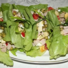 Wykonanie sosu wiosennego: Posiekane zioła i wszystkie składniki dokładnie wymieszać. Wykonanie sałatki: Szynkę,paprykę,jajka i ser żółty pokroić w drobną kostkę.Dodać groszek konserwowy i sos wiosenny-całość dokładnie wymieszać.Gotową sałatkę można wyłożyć do listków radicchio,lollo rosso lub innej sałaty i przewiązać szczypiorkiem.