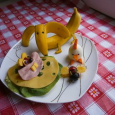 Wykonanie Chleb pokryj masłem, połóż sałatę i ser. Na wierzchu ułóż rzodkiewkę, wytnij w jej przedniej części trójkąt, to będzie otwarty pyszczek. Włóż do niego szynkę. Następnie z sera zrób zęby, uszy i oczy. Z winogrona zrób nos i oczka. Z połówki banana zrób pyszczek psa, w całym oderwij dolną część i wytnij łapki, oczy zrób z ziarenek pieprzu. Kurczaczka zrób z jajka, dziób, łapy i grzebień zrób z marchewki, oczy z ziarenek pieprzu. Pszczółkę zrób z pomidorka, wytnij z niego paski,a w puste miejsce włóż paseczki oliwki. Głowę zrób z oliwki, skrzydła i oczy z sera, a czułki z pietruszki.