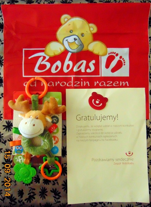 Tym razem udało nam się wygrać główną nagrodę od Bobobaby, grzechotkę interaktywną :) 2 tyg temu wygrałyśmy, dziś przyniósł nam paczkę kurier, nawet dostałyśmy dyplom i reklamówkę hehe. Trzeba ją zamocować przy wózeczku :)