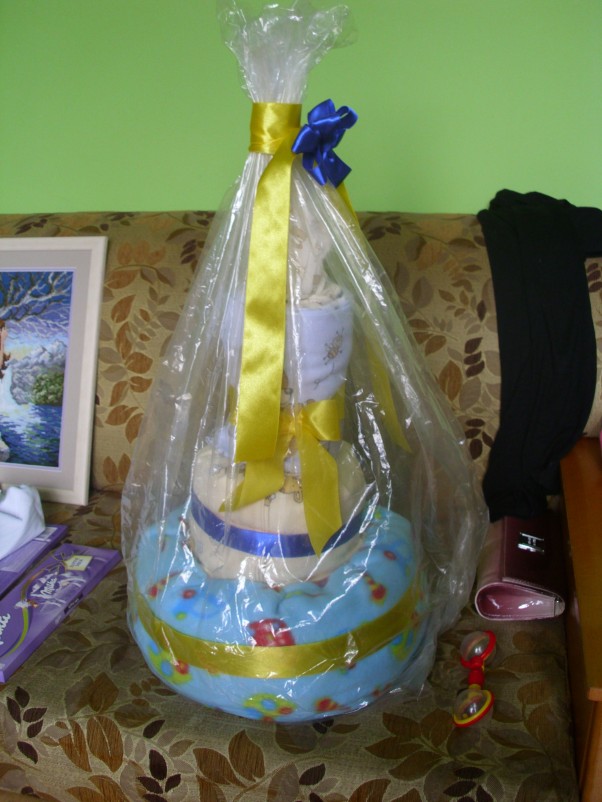 tort z pampersów, kocyków i ubranek zrobiony przez moją siostrę :D