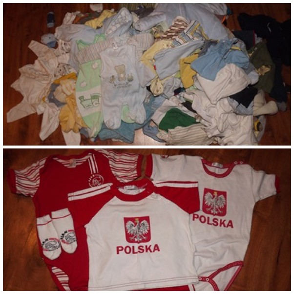 Od jakiegoś czasu dopadły mnie bezsenne noce, bardzo marudziłam mężowi, że nie wiem co mam ze sobą zrobić , więc mój mąż wyciągnął z piwnicy walizkę z ubrankami, które należały do naszego starszego synka i stwierdził, że mogę przecież je posegregować. Ta kopka ubrań nie wygląda może zachwycająco, ale wśród z nich wynalazłam, świetny zestaw małego kibica, oraz body naszej lokalnej drużyny, gdy mieszkaliśmy jeszcze w Holandii. Przypomniało nam się jak Nikodem kibicował z nami w 2008 r. podczas Mistrzostw Europy, co prawda nasza starsza latorośl miłością do sportów nie pała, wyrasta na intelektualistę, więc może młodszy synek przejmie zamiłowanie rodziców do sportu, a kibicowanie zaczniemy od eliminacji do Mistrzostw Europy 2016. Mam nadzieję, że rozmiary ubranek będą pasowały :)