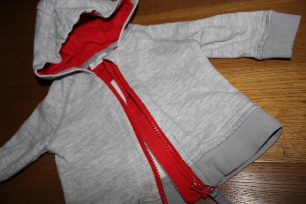 Szara bluza z kapturem z czerwonymi dodatkami na kapturku mamy czerwony grzebień kogucika