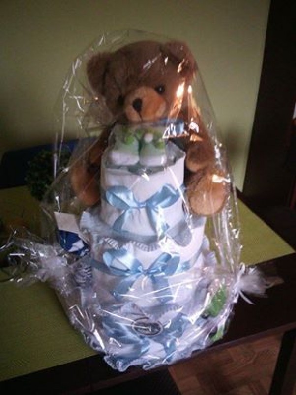 Dzisiejszy dzień był cudowny! Ładnie się ubrałam,umalowałam i popołudniu wyruszyłam do mojej ulubionem kawiarni gdzie czekały już na mnie moje dziewczyny-siostra,szwagierka,bratowa i przyjaciółki. Zrobiły dla mnie przyjęcie baby shower a po polsku bociankowe :-) Była świetna zabawa! Mieszkaniec brzuszka dostał mnóstwo prezentów a to jeden z nich-tort z pampersów.