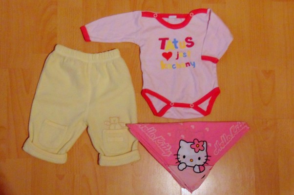 Przy okazji codziennych zakupów moja mama kupiła Julce kolejne ubranka. Oj rozpieszcza tą wnusię, rozpieszcza :) oby nie za bardzo ;) żółte spodnie z polarku, chustka z Hello Kitty, która bardzo mi się podoba i bodziaki z napisem "Tatuś jest kochany"- czyżby babcia Basia chciała się podlizać zięciowi? :P Możliwe xD