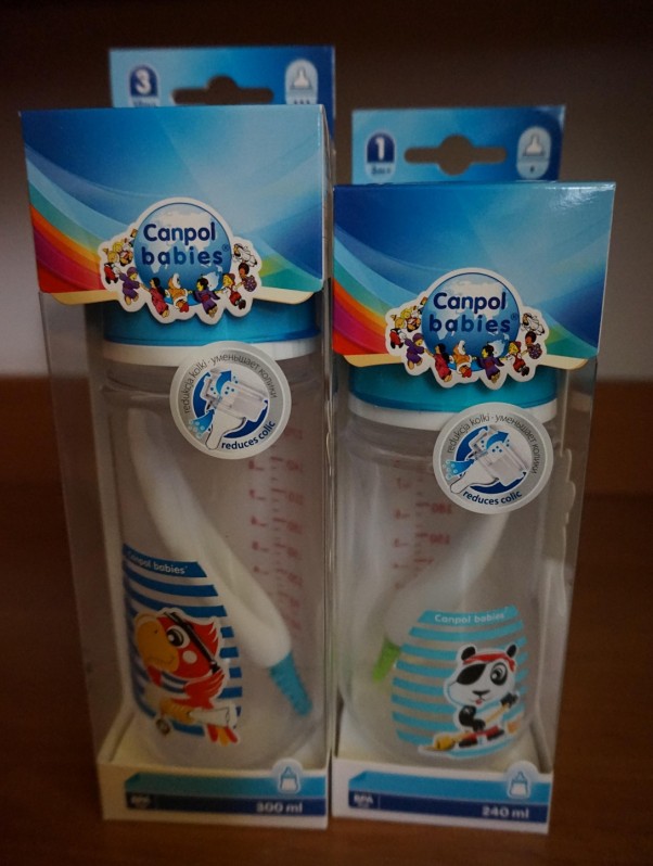 Antykolkowe butelki Canpol. Jedna ze smoczkiem od 3msc, a druga od 12 msc.