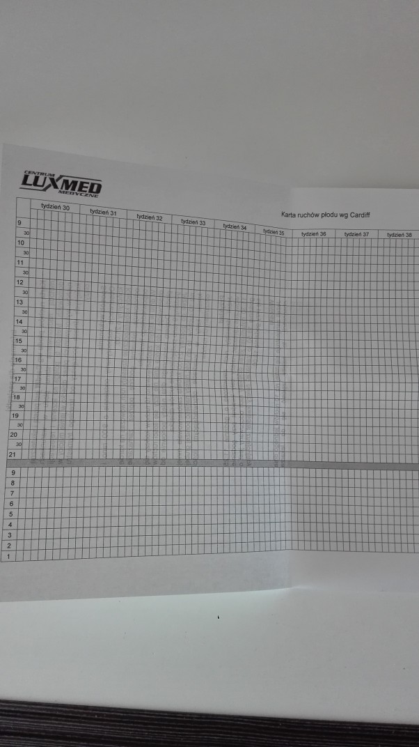 Na wizycie dostałam kartę liczenia ruchów dzidzi metodą Cardiff a wszystko po to by dobrze kontrolować stan Maleństwa także w domu.