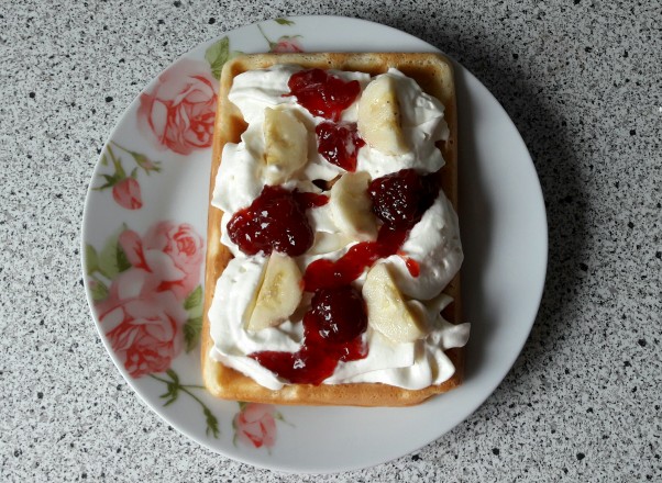 Całą ciążę mam ochotę na coś słodkiego, nawet jak zjem śniadanie czy obiad to za chwilę muszę zjeść chociaż 2 kostki czekolady tak mi cukru potrzeba. Za to z Julią przez całą ciążę nie mogłam patrzeć na słodycze, dopiero w ostatnim miesiącu jadłam słodkie. Dzisiaj zrobiliśmy gofry z córcią, z bitą śmietaną, bananem i konfiturą truskawkową mmm pycha. Ciekawe czy Tymuś to też będzie taki słodki chłopak ;)