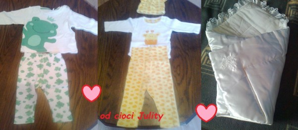 jak nie jedna to druga ciocia coś przyśle :) dzisiaj spisała się ciocia Julita-i pajacyk i piżamka w żabkę co spodobało się tatusiowi i becik do chrztu :) rozpieszczają nas nic nie będę już kupować bo listonosz jak nie jest u nas dwa razy w tygodniu to sąsiedzi myślą że jest chory :)