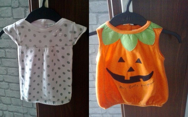 Wybrałam się dzisiaj z synkiem na kilkugodzinne zakupy. Chodziliśmy sobie spokojnie, bez pośpiechu po mieście. Są wakacje, mniej obowiązków. Mieliśmy dużo czasu na oglądanie rzeczy dla niego i dla Lilianki i na cieszenie się sobą. Nie byłabym sobą gdybym nie weszła do second- handu. Jaka była moja radośc gdy wyszukałam takie oto śliczne ciuszki dla córeczki. Już się nie mogę doczekac aż przebiorę dzieciaki na Halloween tym bardziej, że synek też ma kostium dyni ;)