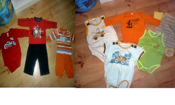Dawno nie zaglądałam do kartonu z ciuszkami po synku. Dzisiaj z racji wolnego popołudnia postanowiłam sobie przypomnieć jakie miał ciuszki, i wybrać te bardziej uniwersalne dla córci. Niestety nie jestem zadowolona z moich odkryć, bo synek miał typowo chłopięce ciuszki. Bardzo mało uniwersalnych. Ciuszki są w naprawdę super stanie a Lilka ich niestety nie założy :( Chyba będę musiała zorganizować pchli targ :) Na zdjęciach przedstawiam te najbardziej uniwersalne kolorystycznie ale niefortunnie nadruki na niektórych są typowo chłopięce. No ale cóż... W domku nikt nie będzie widział :)