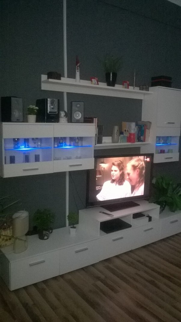 a tak wygląda ściana z najważniejszą dla mnie rzeczą(jeszcze)w tym naszym gniazdku czyli regał z TELEWIZOREM :)