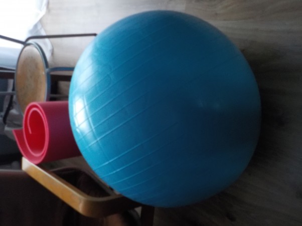 Dostałam od męża dużą, dmuchaną piłkę gimnastyczną. Uwielbiam ją! Nie wiem jak radziłam sobie wcześniej bez niej? Teraz na niej siedzę oglądając telewizję i odciążam biodra, a wieczorem "zwisam" na niej i daję odpocząć zmęczonemu kręgosłupowi. Jest to też okazja do masażu, który chętnie wykonuje mężuś. Coś czuję, że na sali porodowej to będzie mój ulubiony "sprzęt".