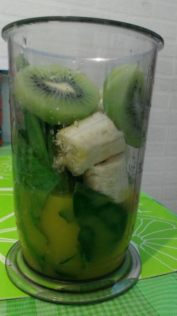 Potrzebujemy 1szkl. swiezo wycisnietego soku z pomaranczy, kiwi, banan i garsc szpinaku, wszystko blendujemy i pijemy :) doskonaly na 2. sniadanie :) pycha!!!