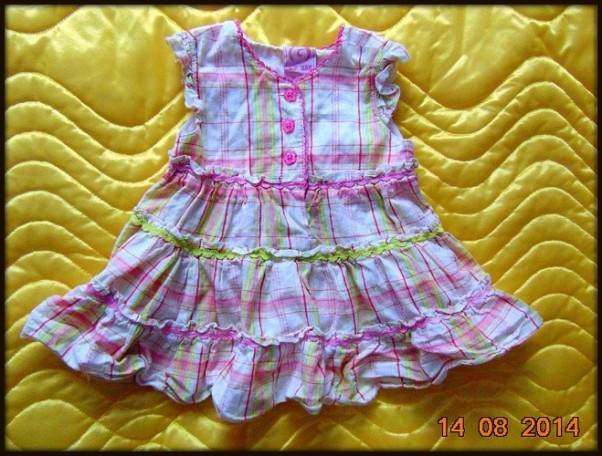 Druga sukieneczka podobna do tej poprzedniej (różowej). Podobny krój i takie same guziczki. Za te 2 kiecki zapłaciłam 3,50zł. No i jak tu nie kupić? :) A tatuś ciągle mówi "Za dużo już tych ubranek, połowy mała nie ubierze", ech ci mężczyźni.. :P ale pocieszam się koleżanki czytając wasze "przygotowania do powitania" że większość przyszłych tatusiów tak ma, nie rozumieją że te wszystkie rzeczy na pewno nam się przydadzą :)