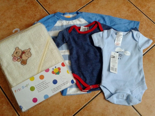 W drodzę powrotnej z Izby przyjęć wstąpiłam do Pepco na małe zakupki. Zawsze gdy mogę coś kupić dla Ciebie działa to na mnie relaksująco. Kupiliśmy z tatusiem body- jedno z nich dołączy do Twojej szpitalnej wyprawki i ręczniczek kąpielowy, który też wezmę dla Ciebie do szpitala. Jak widzisz musisz dać mamie trochę czasu jeszcze bym mogła w całości skompletować dla Ciebie wyprawkę.